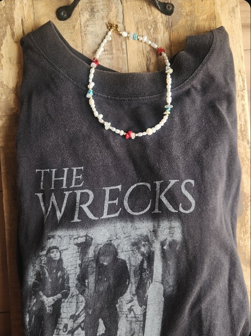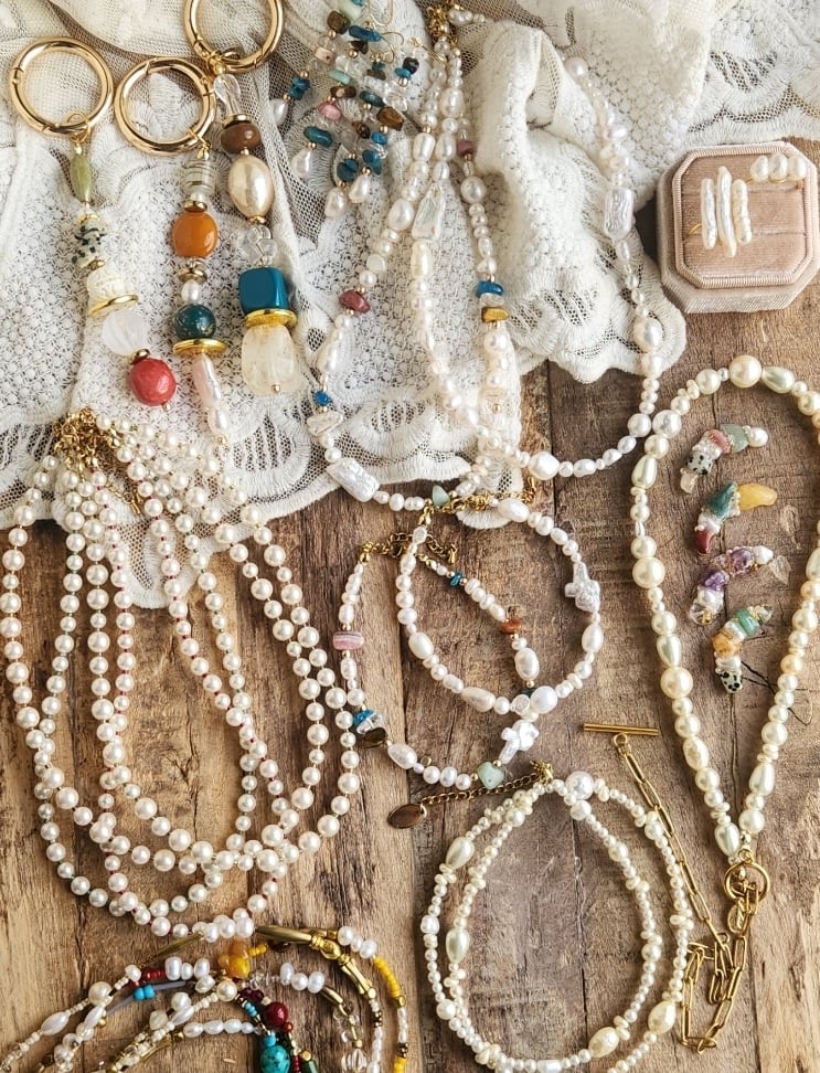 いびつな淡水パールとカラフルな天然石の組み合わせが、シンプルな服を一気に格上げしてくれます。