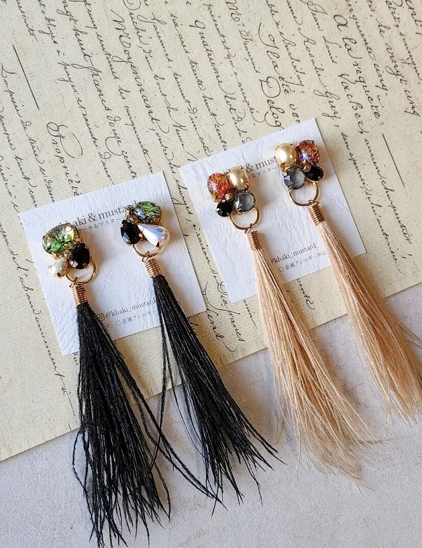 オパールのヴィンテージストーンに孔雀の大人タッセルを合わせたピアス/イヤリング