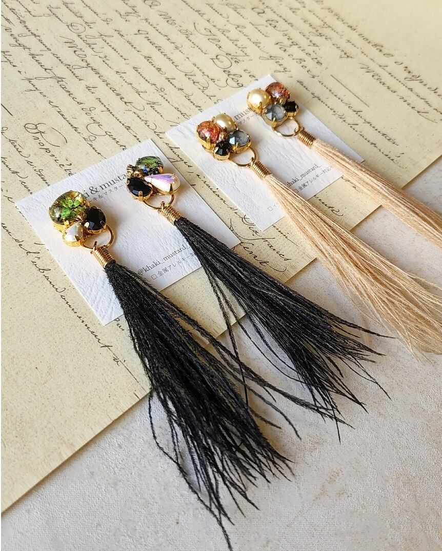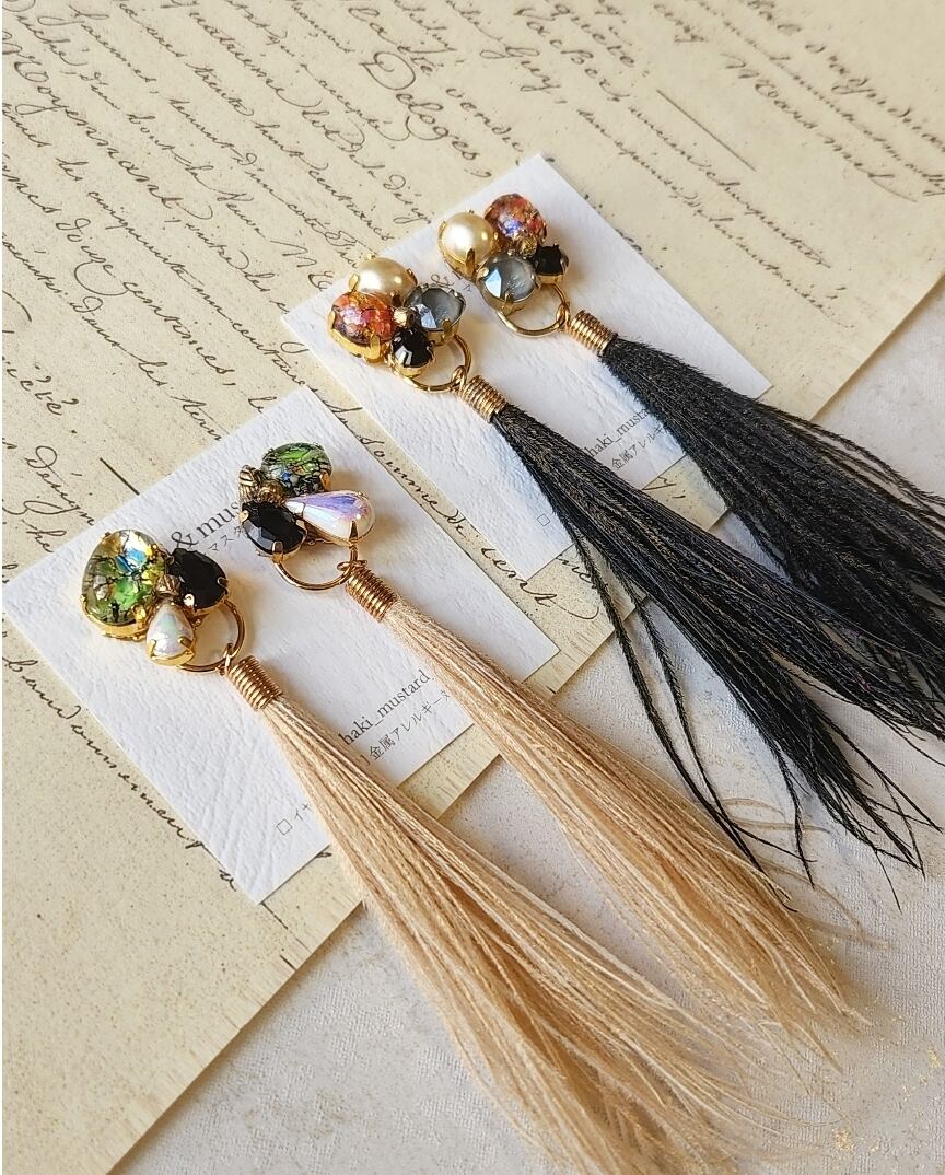 オパールのヴィンテージストーンに孔雀の大人タッセルを合わせたピアス/イヤリング