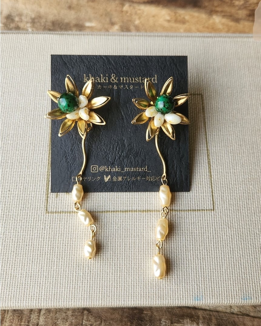 フラワーモチーフの真鍮パーツにグリーンのヴィンテージビーズとチェコビーズを編み込んで、その下に味のあるヴィンテージパールをたらしたピアス、個性的、金属アレルギー対応ピアス