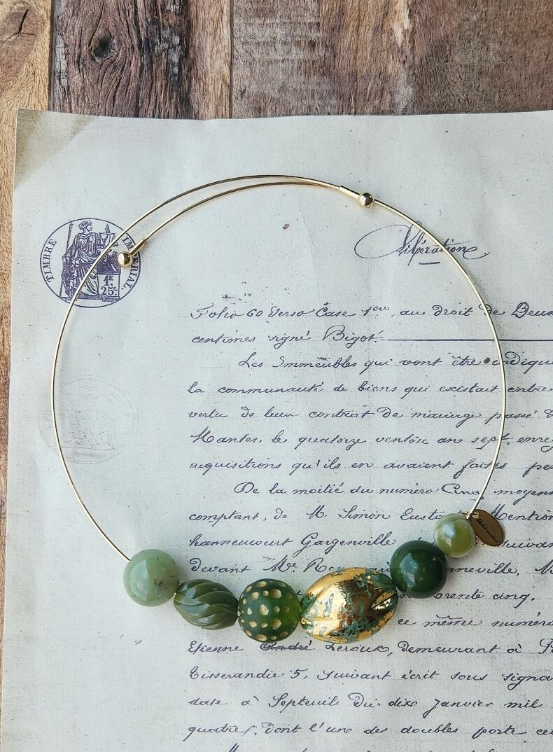 数量限定。vintage beadsチョーカーネックレス☆こだわりのgreen color、ワイヤーネックレス、ステンレス製、大ぶり